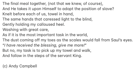 This week, we have been reflecting on the time Jesus washed his disciples feet. Peter resists at first (he thinks he knows best) but when Jesus explains that – without accepting this radical gift from his Rabbi – there can be no relationship, he instead insists Jesus washed his whole body (utterly missing the point).